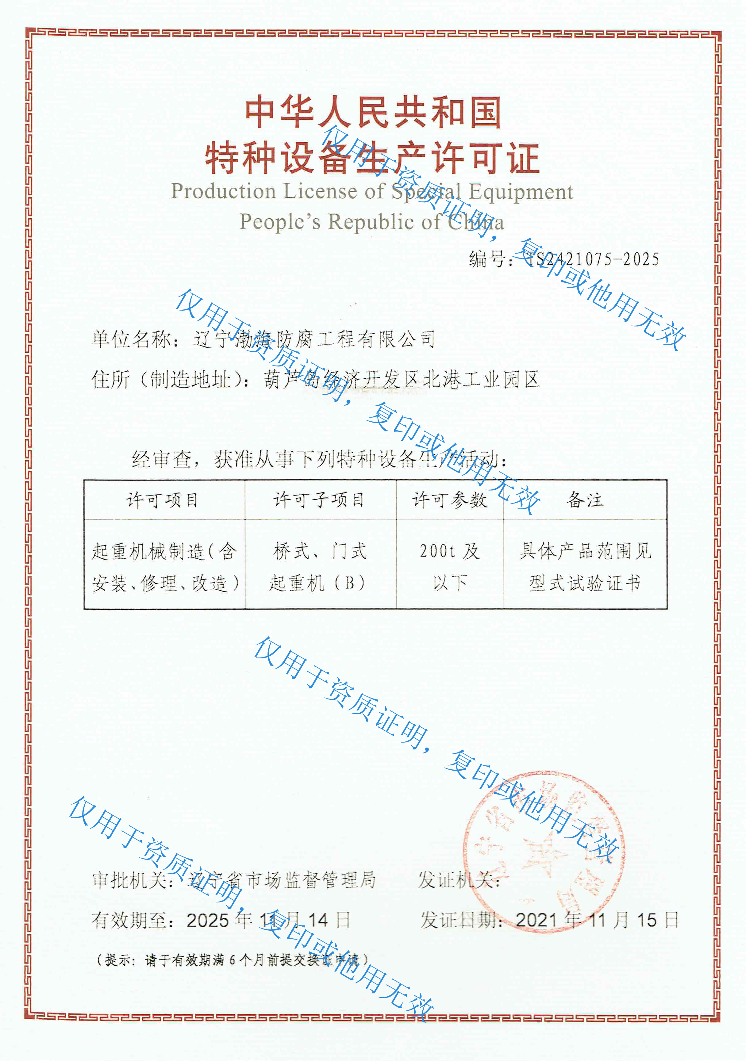 2021年12月1日,東寶集團(tuán)-遼寧渤海防腐工程有限公司順利獲得遼寧省市場監(jiān)督管理局頒發(fā)的《特種設(shè)備生產(chǎn)許可證》,獲準(zhǔn)許從事200t及以下橋式、門式起重機(jī),不分級(jí)塔式起重機(jī)設(shè)備的制造(含安裝、修理、改造)項(xiàng)目,為公司承接特種設(shè)備生產(chǎn)制造業(yè)務(wù)邁出了堅(jiān)實(shí)一步。